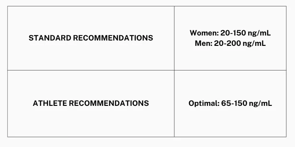 Athlete optimal ranges are influenced by gender, age, frequency, duration, and intensity of training. Due to increased demands for iron as an athlete, optimal serum ferritin ranges vary from the general population recommendations.