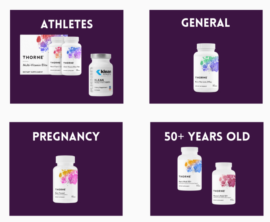 At GracesGrit, we like to recommend different multivitamins based on individual needs. Thorne and Klean Athlete are some of our favorite trustworthy brands across the lifespan!