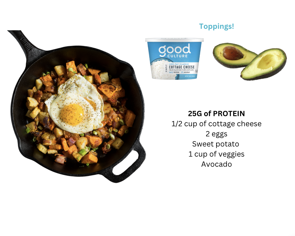 Cottage cheese is a great protein source that adds creaminess to dishes. Consider adding chicken sausage or turkey bacon to this meal as well if your protein needs are high. This dish is filled with healthy fats, fiber, protein, and flavor. Savory breakfasts are highly underrated!