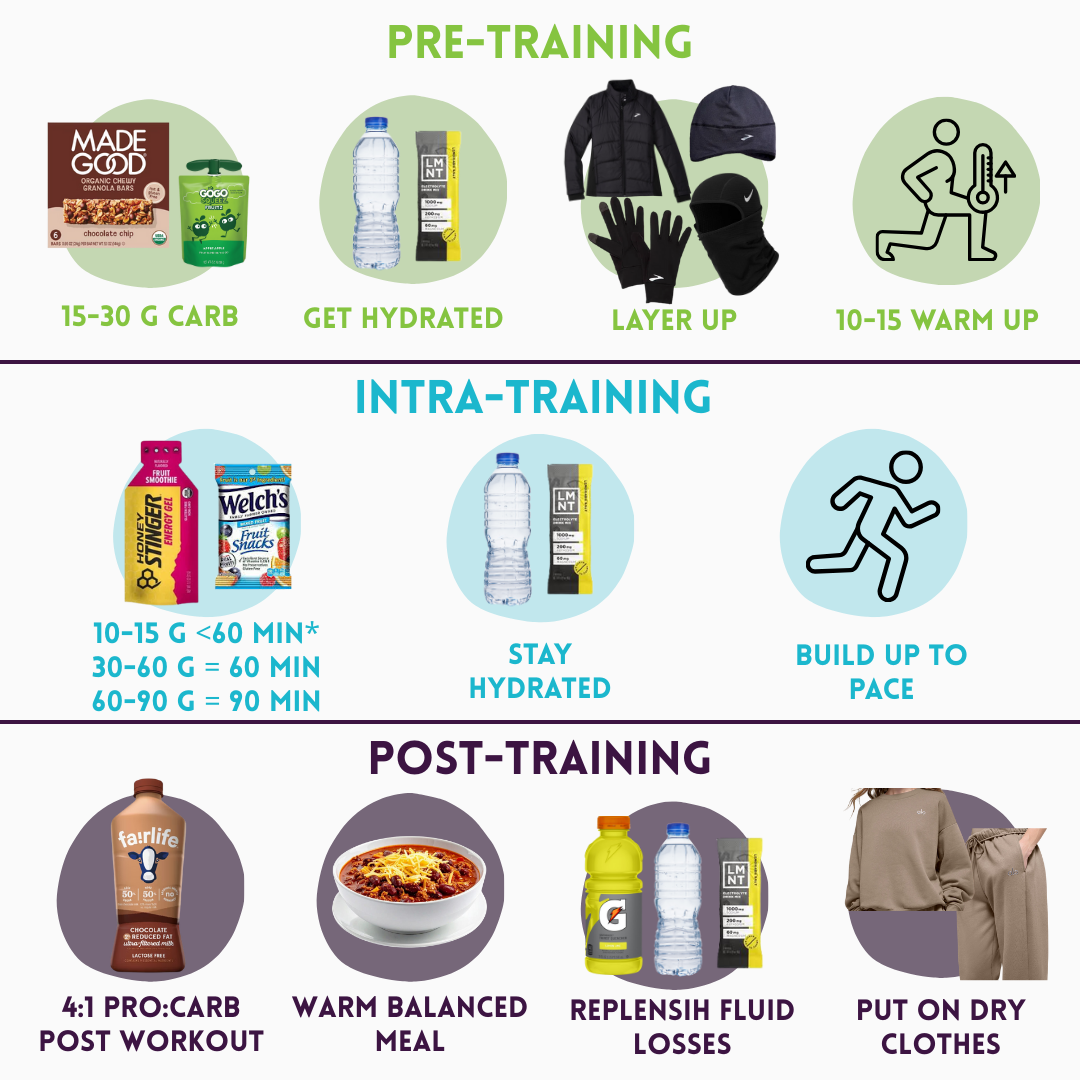 The key to training in the cold is to start warm and stay warm all while fueling adequately. Nailing down your nutrition, hydration, and injury prevention strategies can help the winter season seem shorter. Below is what this practically looks like before, during, and after training.